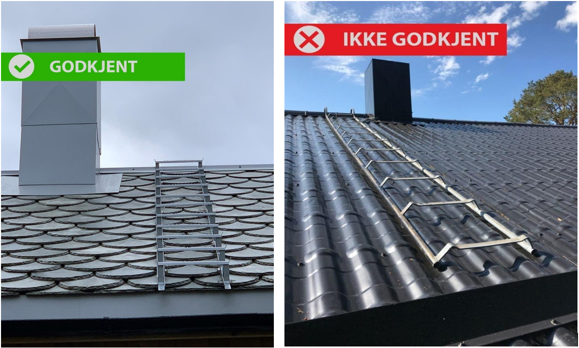 Figur 1: Takstige festet i topp og bunn i bærende konstruksjoner. Figur 2: Bøyletakstige hengt over møne med kjetting rundt pipa.