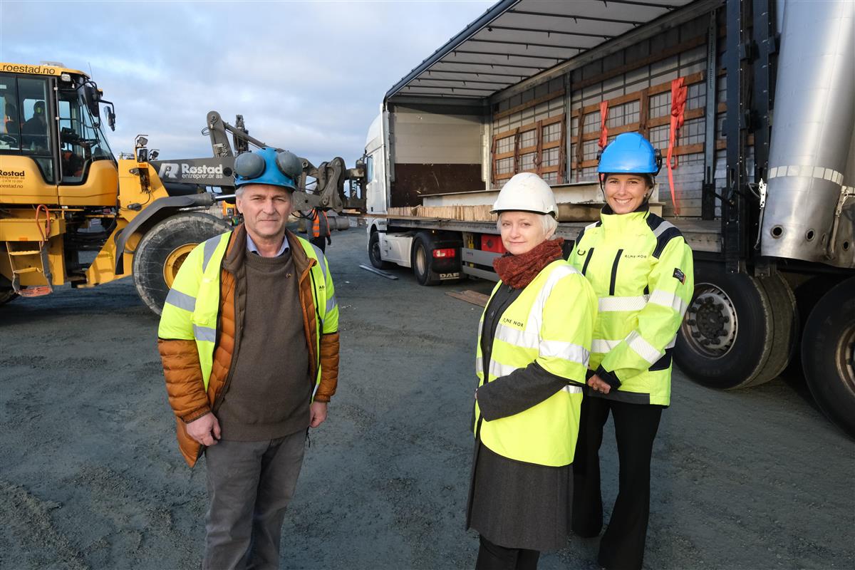 Den 14 år gamle brua gis som gave til Ukraina fra Levanger kommune og Bane NOR. Her lastes den på trailer som tar den med for å erstatte en istykkerbombet bru. Fra venstre Tor Albert Kverkild fra foreningen Midt-Norge for Ukraina, ordfører Anita Ravlo Sand og Ingunn Skaufel, prosjektsjef for kapasitetsøkende tiltak på Trønderbanen i Bane NOR.