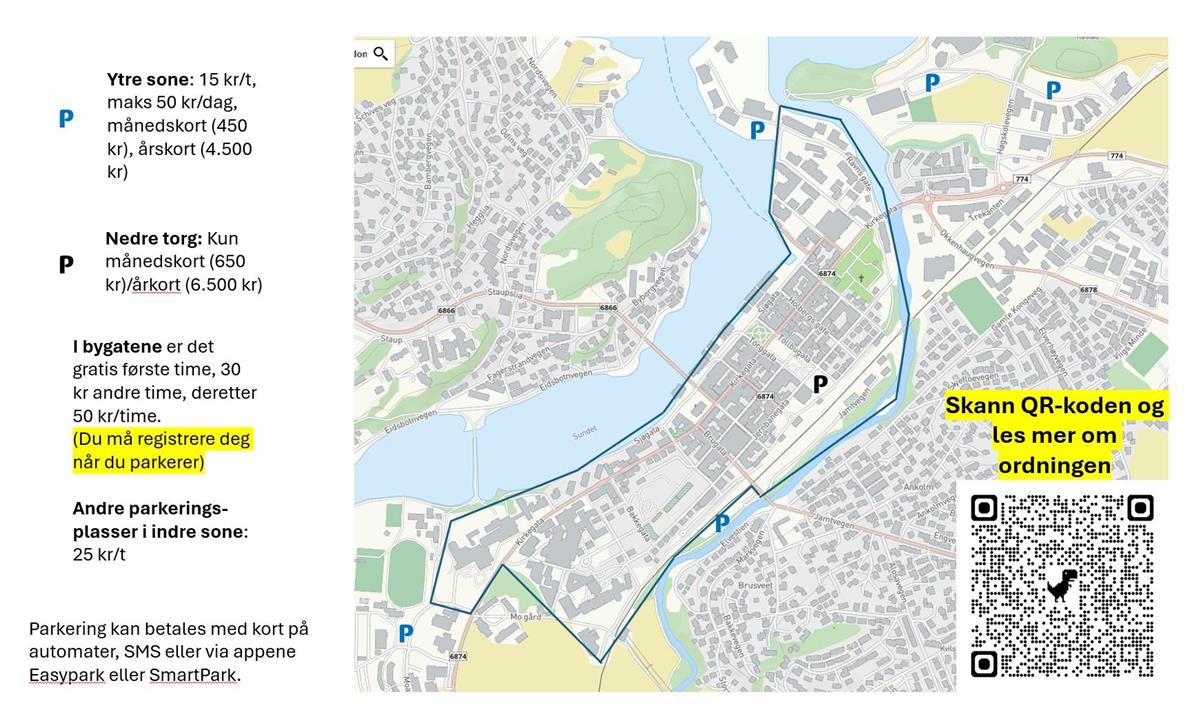 - Gateparkering: gratis første time, 30 kr andre time, deretter 50 kr/t for resterende timer.